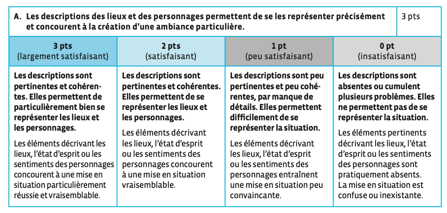 La grille critériée mise à disposition des enseignants pour la correction de textes vise à évaluer un objet spécifique, à savoir la description de personnages et de lieux. Il s’agit de deux catégories de descriptions héritées de la rhétorique (Adam & Revaz 1996: 32): le portrait physique (prosopographie) et moral (éthopée), ainsi que la description des lieux (topographie).