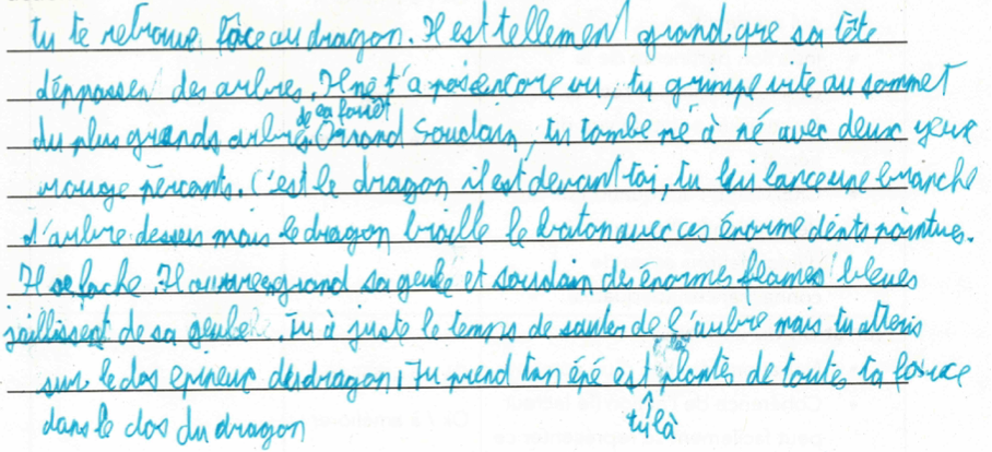 Bien que ces deux textes soient liés à un même enseignement, leur qualité diffère sensiblement. Le premier texte insère des éléments de description assez maladroitement dans le récit d’un combat, raconté de manière peu précise à l’aide d’une syntaxe parfois problématique et d’un vocabulaire assez pauvre. La compréhension du récit est alors compromise, le lecteur doit se concentrer pour saisir ce que fait et voit le héros. Il est également difficile de comprendre que la créature décrite est un dragon. Dans un récit aussi problématique, la description réalisée n’est alors ni expressive (signaler un point de vue) ni narrative (immerger le lecteur, rythmer le récit). Le second texte, quant à lui, fonctionne plutôt bien avec des descriptions insérées avec pertinence dans un récit efficace: le lecteur parvient sans problème à suivre le héros lors de sa rencontre avec un dragon. La description de la créature peut alors se doter de fonctions expressives et narratives.